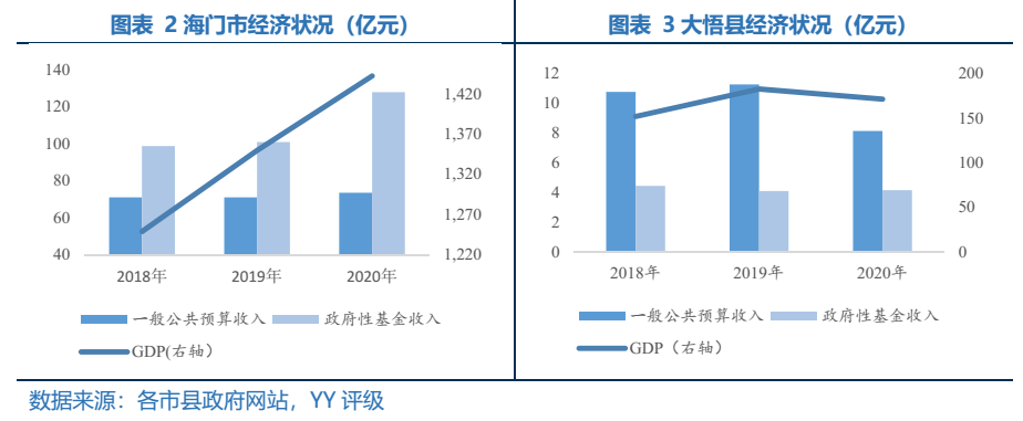 東部更多縣城入選,可能因?yàn)闁|部經(jīng)濟(jì)更為發(fā)達(dá),更大體量的經(jīng)濟(jì)可撐起更多的融資空間,加碼基建,以進(jìn)行逆周期調(diào)節(jié)。例如江蘇省隸屬于南通市的海門市,與上海直線距離為60公里,區(qū)位條件優(yōu)越,支柱產(chǎn)業(yè)包括先進(jìn)裝備制造等。2020年實(shí)現(xiàn)GDP1442.6億元,一般公共預(yù)算收入73.5億元,政府性基金收入128億元,經(jīng)濟(jì)實(shí)力較強(qiáng);海門市尚未有城投發(fā)行債券,不考慮城投有息負(fù)債,地方政府債務(wù)余額/一般公共預(yù)算收入為2.04,地方政府債務(wù)余額/(一般公共預(yù)算收入+政府性基金收入)為0.74,海門市債務(wù)負(fù)擔(dān)較輕,有較大的融資空間。而西部一些經(jīng)濟(jì)薄弱縣城入選主要因?yàn)檎邇A斜,例如湖北省孝感市下的大悟縣,地處大別山西端南麓,整體經(jīng)濟(jì)發(fā)展水平偏弱,2020年4月才脫貧摘帽,2019年GDP為182.8億元(考慮到2020年疫情影響,選用2019年數(shù)據(jù)),一般預(yù)算收入為11.23億元,政府性基金收入為4.15億元,考慮到大悟縣為著名革命老區(qū),發(fā)改委給予一定的政策支持,希望該縣能借助資本市場(chǎng)進(jìn)行融資以發(fā)展當(dāng)?shù)亟?jīng)濟(jì)。