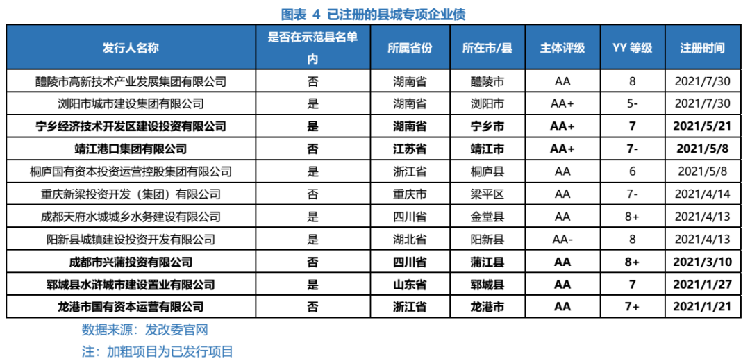 現(xiàn)在,距離縣城專項(xiàng)企業(yè)債發(fā)行指引正式發(fā)布已有一年,我們對(duì)縣城專項(xiàng)企業(yè)債注冊(cè)發(fā)行情況繼續(xù)跟蹤,目前發(fā)行來看不及預(yù)期(弱資質(zhì)+長(zhǎng)久期還是比較困難的)。