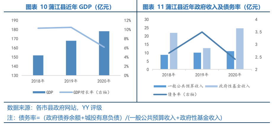 蒲江縣經(jīng)濟(jì)規(guī)模相對(duì)較小,但是屬于成都“半小時(shí)經(jīng)濟(jì)圈”,具有一定的發(fā)展?jié)摿Γ曰鹗杖胍?guī)模相對(duì)較高,債務(wù)率相對(duì)較低。蒲江縣為成都市遠(yuǎn)郊縣之一,支柱產(chǎn)業(yè)為小機(jī)械制造和生態(tài)食品。蒲江縣區(qū)位較好,屬于成都“半小時(shí)經(jīng)濟(jì)圈”,毗鄰天府新區(qū),待天蒲快速路新建工程(18km)完工后將進(jìn)一步拉近蒲江縣和天府新區(qū)距離。蒲江縣是“進(jìn)藏入滇”的咽喉要道,投資百億元的川藏鐵路蒲江鐵路物流港已在建設(shè),中德國(guó)別合作區(qū)已招商,蒲江縣具有一定的發(fā)展?jié)摿Α?020年實(shí)現(xiàn)GDP178.18億元,2018、2019年GDP增速為10%左右,一般公共預(yù)算收入為10.94億元,經(jīng)濟(jì)規(guī)模偏小但增速較高。近年蒲江縣房?jī)r(jià)為上升趨勢(shì),根據(jù)房天下,2020年住宅成交均價(jià)在7600元左右,2020年政府性基金收入24.66億元,政府性基金收入相較于經(jīng)濟(jì)規(guī)模偏高。地方債務(wù)率在250%左右,債務(wù)率相對(duì)偏低。