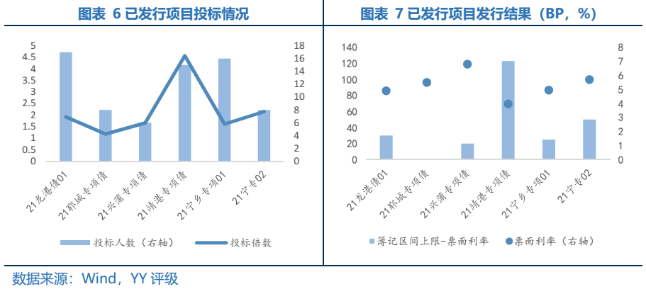 投資人對(duì)已發(fā)項(xiàng)目認(rèn)購(gòu)熱情總體相對(duì)一般。從全場(chǎng)倍數(shù)來看,除了“21靖港專項(xiàng)債”和“21寧專02”全場(chǎng)認(rèn)購(gòu)倍數(shù)超過2倍,其余4只債券全場(chǎng)倍數(shù)均低于2倍;從“簿記區(qū)間上限-票面利率”這一指標(biāo)來看,“21靖港專項(xiàng)債”為123BP,其他項(xiàng)目為0至50BP。由鄆城縣水滸城市建設(shè)置業(yè)有限公司發(fā)行,重慶三峽融資擔(dān)保集團(tuán)股份有限公司進(jìn)行擔(dān)保的“21鄆城專項(xiàng)債”,投資者關(guān)注度相對(duì)較弱。全場(chǎng)認(rèn)購(gòu)倍數(shù)為1.18,最終票面利率發(fā)在簿記區(qū)間上限5.5%。根據(jù)《21世紀(jì)經(jīng)濟(jì)報(bào)道》的報(bào)道,該債券被爆出發(fā)行人通過買保險(xiǎn)抵補(bǔ)利差的方式發(fā)行。投資者關(guān)注度最高的項(xiàng)目為由靖江港口集團(tuán)有限公司發(fā)行,中債信用增進(jìn)投資股份有限公司進(jìn)行擔(dān)保的“21靖港專項(xiàng)債”,該項(xiàng)目全場(chǎng)倍數(shù)為4.57,票面利率為3.97%,距離簿記區(qū)間上限5.2%有123BP。一方面,雖然發(fā)行人YY等級(jí)為7-,但是中債信用增進(jìn)投資股份有限公司為其提供擔(dān)保,增信效力較強(qiáng),債項(xiàng)資質(zhì)較好。另一方面,根據(jù)Wind,發(fā)行人靖江港口集團(tuán)有限公司已發(fā)行20期債券,總計(jì)規(guī)模為99.1億元,存續(xù)債券為53.1億元,發(fā)行人所處江蘇省靖江市,投資人對(duì)發(fā)行主體和區(qū)域有一定了解和認(rèn)可。