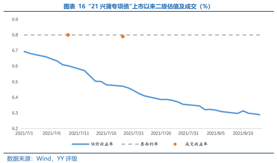 上市后二級(jí)估值一路下行,下行幅度高于可比中債中短期票據(jù)收益率。“21興蒲專項(xiàng)債”票面利率為6.80%,上市首日2021年7月1日二級(jí)估值已低于其票面利率11BP至6.69%。由于銀行間流動(dòng)性充足和機(jī)構(gòu)配置力量加強(qiáng),二級(jí)估值一路下行41BP至2021年8月13日的6.29%。較同期AAA級(jí)5年期中債中短期票據(jù)到期收益率下行36BP,“21興蒲專項(xiàng)債”二級(jí)估值下行幅度更大。若機(jī)構(gòu)在一級(jí)進(jìn)行申購(gòu),在此期間內(nèi)賬面可獲得一定的浮盈。