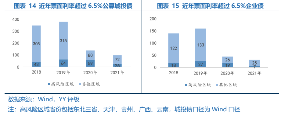 票面利率為6.80%的企業(yè)債在目前環(huán)境下且買且珍惜。“21興蒲專項(xiàng)債”票面利率為6.80%,高于發(fā)行當(dāng)日AAA級(jí)5年期中債中短期票據(jù)到期收益率304BP,絕對(duì)收益和相對(duì)收益都較高,能滿足多數(shù)機(jī)構(gòu)對(duì)收益率的要求。再考慮到目前監(jiān)管嚴(yán)控城投債務(wù)的決心,從2020年3月鹽城清退收益8%以上的非標(biāo)融資、2021年年初“紅橙黃綠”新政策的執(zhí)行、以成本更低的地方債替代城投債,市場(chǎng)上高收益的城投非標(biāo)和標(biāo)債供給逐漸減少。公募城投債是城投信仰的最后一道防線,高收益公募城投債在一定程度上兼顧了違約風(fēng)險(xiǎn)和收益。近年票面利率超過6.5%的公募城投債和企業(yè)債數(shù)量急劇下降,同時(shí)考慮到高風(fēng)險(xiǎn)區(qū)域部分機(jī)構(gòu)不能入庫(kù),高收益公募城投債更少。票面利率達(dá)6.80%的“21興蒲專項(xiàng)債”在目前的市場(chǎng)環(huán)境下,顯得有些突兀,但是如果站在利差和時(shí)間走勢(shì)角度而言,這個(gè)收益率可能市場(chǎng)很多機(jī)構(gòu)難以入庫(kù),但是其另一面的收益面,可能也提供了一些風(fēng)險(xiǎn)抵御的思路。