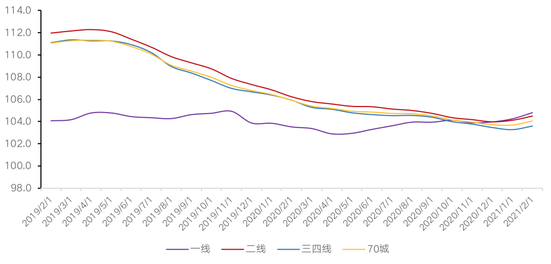 2021年前2月,全國新房銷售價格呈現同比上漲趨勢,漲幅趨于平穩。各能級環比漲幅有升有降,其中一線城市環比漲幅最高。具體來說,一線城市新建商品住宅銷售價格環比上漲0.5%,漲幅比上月回落0.1個百分點;二線城市上漲0.4%,漲幅與上月持平;三線城市環比上漲0.3%,漲幅比上月擴大0.1個百分點。