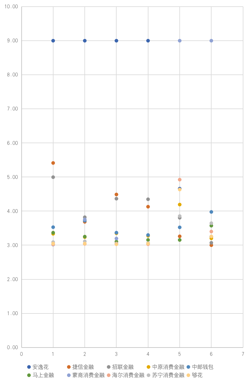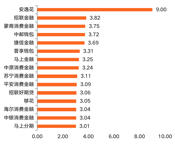 在月使用時長指標上,安逸花APP優勢突出,遙遙領先于其他消費金融APP,達到9分。招聯金融APP、蒙商消費金融APP分別為第二名(3.82分)和第三名(3.75分),均未超過4分。