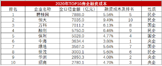 炸天團(tuán)特意將2020年克而瑞榜單TOP10房企拉出來(lái),將排名及融資成本做了個(gè)對(duì)比: