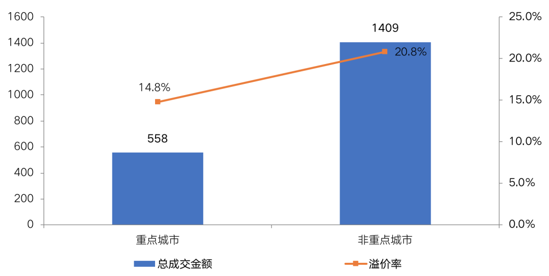 和非重點城市成交規模和溢價率(億元)