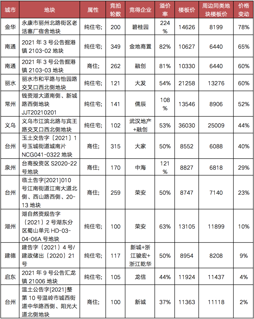 值得注意的是,從區域上看,“兩集中”新政落地之后,非重點城市的熱度上升的同時,高熱地塊進一步向郊縣“下沉”,譬如南通的如東縣、啟東市、金華的永康市、義烏市,臺州的玉環市、臨海市、溫嶺市等等,均有競拍輪數超百輪的高熱地塊成交。