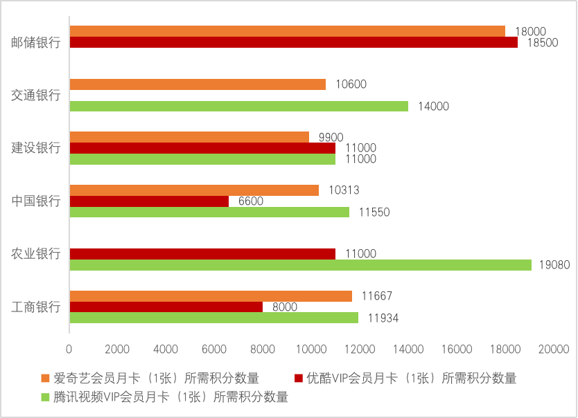 在積分兌換環(huán)節(jié),各家銀行信用卡的積分壁壘并未打破,價值分化明顯。以部分視頻類會員卡兌換權(quán)益為例,在國有六大行中,用積分全額兌換騰訊視頻VIP會員月卡、愛奇藝會員月卡、優(yōu)酷會員月卡,建設(shè)銀行兌換前兩種視頻月卡權(quán)益所需積分最少(積分含金量最高),中國銀行兌換第三種月卡權(quán)益,所需積分最少。兌換同樣的權(quán)益,對應(yīng)的每家銀行積分?jǐn)?shù)量價值存在“積分差”。