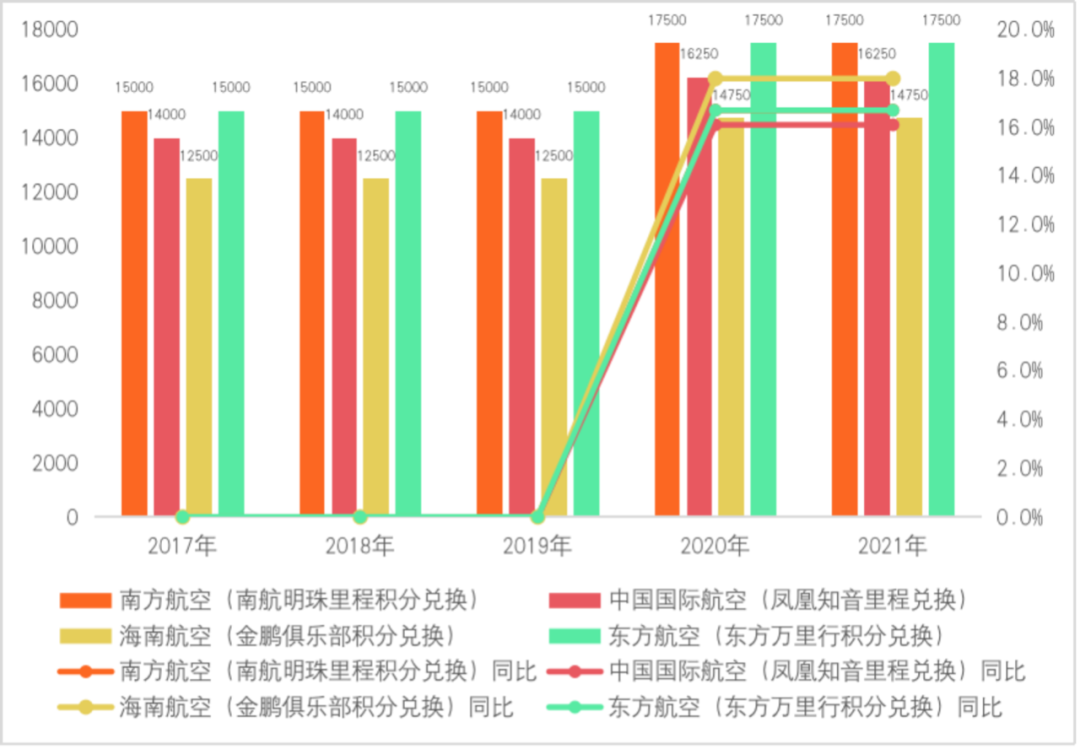 以中國銀行積分兌換航空里程為例。從2017年到2021年,中國銀行與國內(nèi)各家航空公司的里程積分兌換比例出現(xiàn)調(diào)整,積分價值下滑趨勢明顯。其中2020年中國銀行積分兌換南方航空、中國國際航空、海南航空、東方航空1航空里程所需積分?jǐn)?shù)量均出現(xiàn)超過10%的增長,特別是2020年中國銀行積分兌換1航空里程海南金鵬俱樂部積分所需積分?jǐn)?shù)量同比增長率達(dá)到18%。
