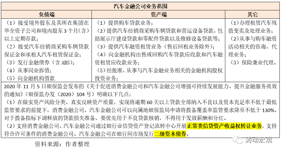 當(dāng)然,政策層面目前正采取一些舉措改善汽車金融公司的資金來源單一的問題。例如,2020年11月5日銀保監(jiān)會發(fā)布的《關(guān)于促進(jìn)消費(fèi)金融公司和汽車金融公司增強(qiáng)可持續(xù)發(fā)展能力、提升金融服務(wù)質(zhì)效的通知》(銀保監(jiān)辦發(fā)(2020)104號)便提出支持消費(fèi)金融公司、汽車金融公司通過銀行業(yè)信貸資產(chǎn)登記流轉(zhuǎn)中心開展正常類信貸資產(chǎn)收益權(quán)轉(zhuǎn)讓業(yè)務(wù),支持符合許可條件的消費(fèi)金融公司、汽車金融公司在銀行間市場發(fā)行二級資本債券。