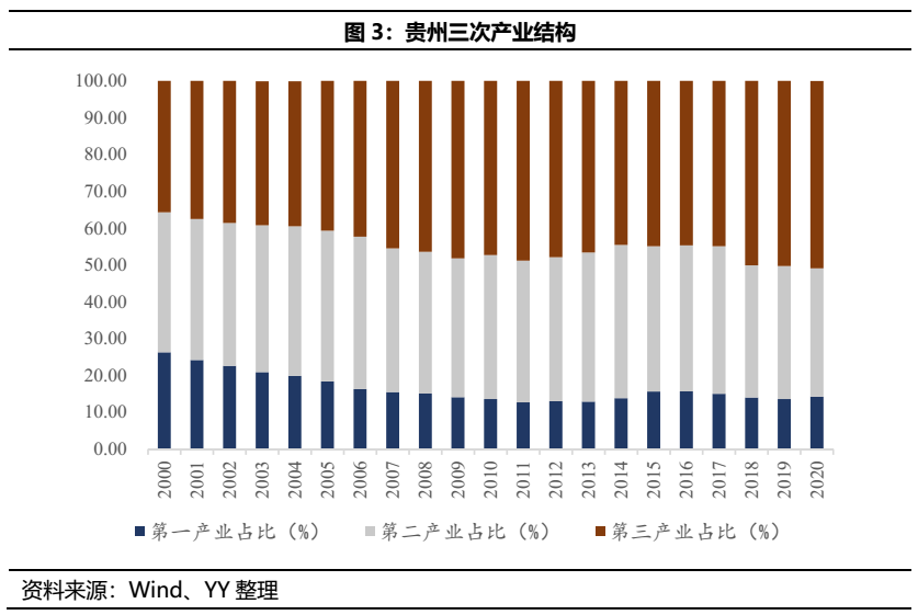 產(chǎn)業(yè)結(jié)構(gòu)來(lái)看,由于煙酒、特色食品、醫(yī)藥等傳統(tǒng)產(chǎn)業(yè)的存在,貴州第一產(chǎn)業(yè)比重仍然較高;近三年來(lái),作為基建大省的貴州固投增速顯著放緩,煤炭等傳統(tǒng)能源密集型產(chǎn)業(yè)規(guī)模也有所萎縮,二產(chǎn)占比隨之下降;依托數(shù)字經(jīng)濟(jì)、旅游、煙酒等對(duì)相關(guān)產(chǎn)業(yè)的帶動(dòng),貴州三產(chǎn)比重近年來(lái)已超50%。目前貴州支柱產(chǎn)業(yè)仍是主要依托于區(qū)域自然稟賦驅(qū)動(dòng)的電力、能源、建材、煙酒、化工等,兼以發(fā)展先進(jìn)裝備制造、基礎(chǔ)材料、生態(tài)特色食品、大數(shù)據(jù)電子信息以及健康醫(yī)藥。