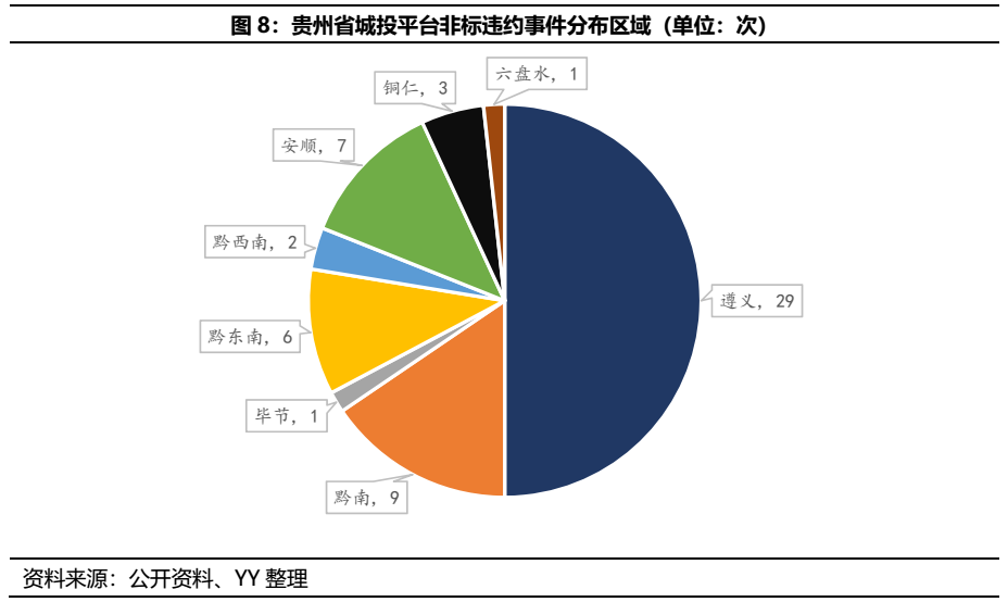 前文已提到,貴州債務(wù)問(wèn)題十分突出,政府債務(wù)余額與存續(xù)債城投有息債務(wù)之和達(dá)27,088.62億元,是其GDP的1.5倍,YY-Ratio也達(dá)到822.8666%,全國(guó)第一。除此之外,貴州更是非標(biāo)違約的重災(zāi)區(qū),據(jù)不完全統(tǒng)計(jì),截至目前貴州發(fā)生的城投平臺(tái)非標(biāo)違約事件至少已達(dá)58起,除貴陽(yáng)外,其余8個(gè)市州均有涉及,以遵義、黔南最為集中,違約主體涵蓋市級(jí)平臺(tái)和區(qū)縣級(jí)平臺(tái)。頻發(fā)的非標(biāo)違約事件,又給貴州區(qū)域形象蒙上了一層陰影。