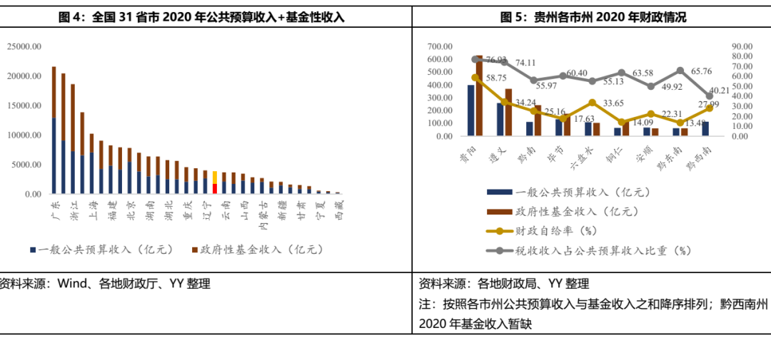 2020年,貴州省一般公共預(yù)算收入1,786.78億元,同比增長(zhǎng)1.1%,其中稅收收入1,086.02億元,占比60.78%,收入質(zhì)量和穩(wěn)定性偏低;同年一般公共預(yù)算支出5,723.27億元,以一般公共預(yù)算收入/一般公共預(yù)算支出來(lái)衡量的財(cái)政自給率僅為31%;政府性基金收入2,047.12億元,同比增長(zhǎng)19.6%,其中土地使用權(quán)轉(zhuǎn)讓收入1,860.92億元,對(duì)賣地收入依賴很大;另有中央轉(zhuǎn)移支付3,258.6億元,在貴州的財(cái)政體系中對(duì)上級(jí)依賴很大。