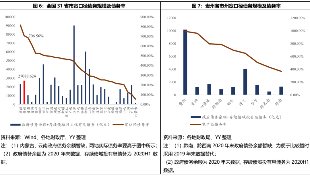 貴州債務(wù)問(wèn)題可謂老生常談,由于經(jīng)濟(jì)基礎(chǔ)較弱且常年大興基建,貴州省整體債務(wù)水平較重,政府顯隱性債務(wù)之和遠(yuǎn)高于經(jīng)濟(jì)水平相近的廣西、山西等省份。采用(政府債務(wù)余額+存續(xù)債城投主體有息債務(wù))/(一般公共預(yù)算收入+政府性基金收入)來(lái)衡量寬口徑債務(wù)率,貴州省達(dá)706.56%,在全國(guó)31個(gè)省市中排名第二。