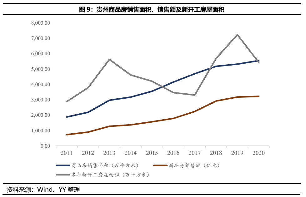 不過(guò)從新開(kāi)工面積和土地成交情況來(lái)看,2020年貴州全省房屋新開(kāi)工面積5,441.06萬(wàn)平方米,同比下降24.8%,降幅較前三季度均擴(kuò)大;2020年貴州房開(kāi)企業(yè)土地購(gòu)置面積348.57萬(wàn)平方米,比上年減少34.8%,降幅較前三季度擴(kuò)大,全年土地成交價(jià)款同比減少17.9%,降幅較前三季度也呈擴(kuò)大態(tài)勢(shì)。新開(kāi)工面積與土地成交呈現(xiàn)高位負(fù)增長(zhǎng)態(tài)勢(shì),且降幅隨季度擴(kuò)大,表明疫情這一短期沖擊因素并非主因,而是開(kāi)發(fā)商拿地及開(kāi)盤(pán)意愿有所減弱,可能是受銷售市場(chǎng)回升緩慢及融資端受鉗制等原因影響。地產(chǎn)市場(chǎng)后勁不足,對(duì)于土地財(cái)政依賴程度較高的貴州省來(lái)說(shuō)將可能引發(fā)連鎖反應(yīng),后續(xù)需持續(xù)關(guān)注貴州地產(chǎn)市場(chǎng)的走勢(shì)。