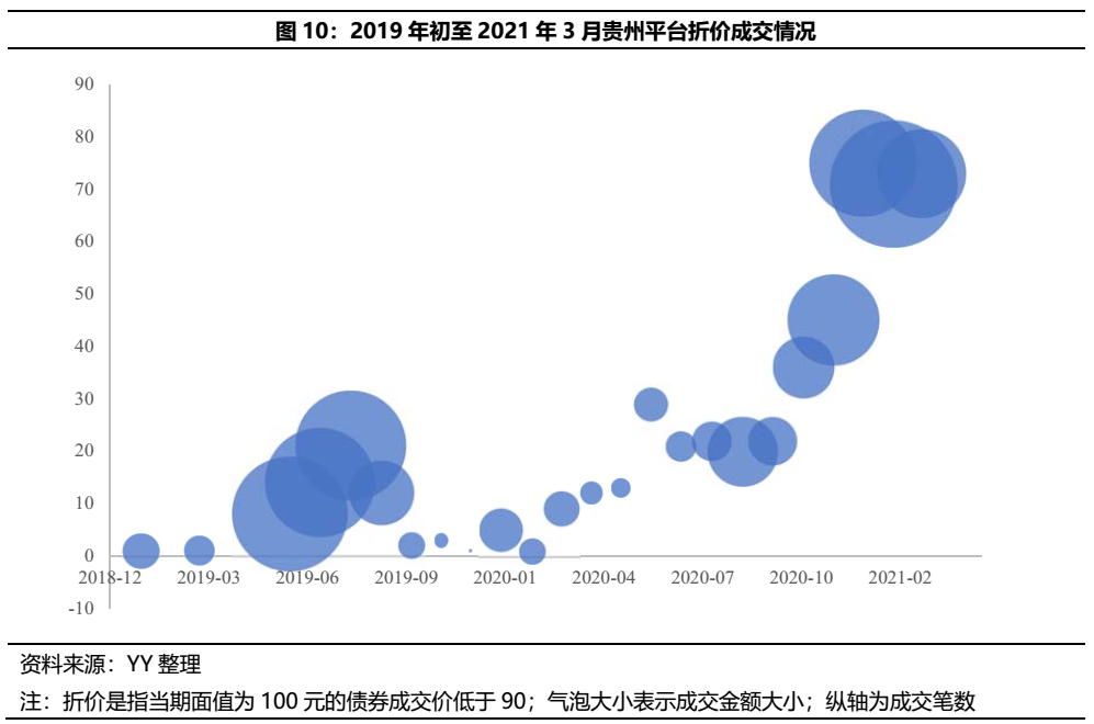貴州省城投債折價(jià)成交頻繁,特別是2020年末以來(lái),折價(jià)成交筆數(shù)及折價(jià)成交額的提升斜率加大,可能部分受永煤事件帶來(lái)的市場(chǎng)情緒擾動(dòng)影響。