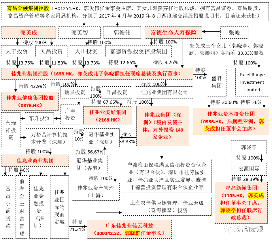 1、郭氏家族包括郭氏一代和郭氏二代。其中郭氏三兄弟包括郭俊偉(老大)、郭英成(老二)、郭英智(老三)等三兄弟,三人出生于廣東揭陽普寧,早年移居香港,目前郭英成(出生于1965年)和郭英智(出生于1967年)分別持有佳兆業(yè)集團(tuán)控股25.28%和13.73%的股權(quán)(合計(jì)持股39.01%),而郭俊偉與郭英智兩兄弟則共同掌控位于香港的富昌金融集團(tuán)控股(旗下?lián)碛懈徊C券、富昌期貨及富昌資產(chǎn)管理等多家主體)。