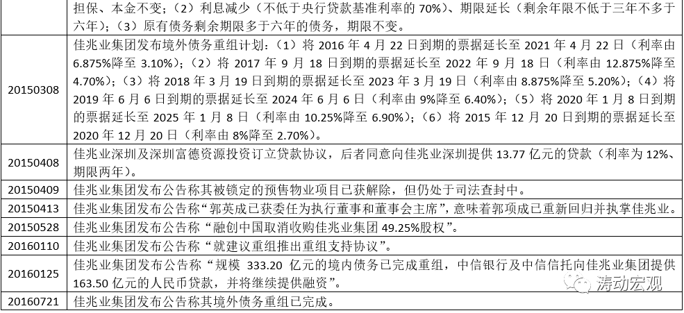(3)2015年1月佳兆業(yè)集團(tuán)1月觸發(fā)了匯豐銀行貸款的違約事項(xiàng),可能導(dǎo)致一系列債務(wù)的交叉違約條款,為此2015年2月開始佳兆業(yè)開啟債務(wù)重組進(jìn)程。當(dāng)時(shí)債務(wù)重組涉及境內(nèi)外債務(wù)合計(jì)650.09億元,其中境內(nèi)債務(wù)合計(jì)497.70億元。