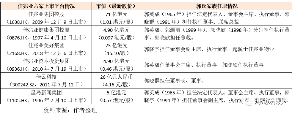 2、這六家上市主體的一把手基本均由郭氏家族擔(dān)任,如郭英成分別擔(dān)任佳兆業(yè)集團(tuán)控股、佳兆業(yè)資本投資集團(tuán)的董事會(huì)主席、星島新聞集團(tuán)的法定代表人和董事會(huì)主席,而郭英成的三個(gè)子女郭曉群、郭曉欣、郭曉亭也在六家上市主體中擔(dān)任要職。