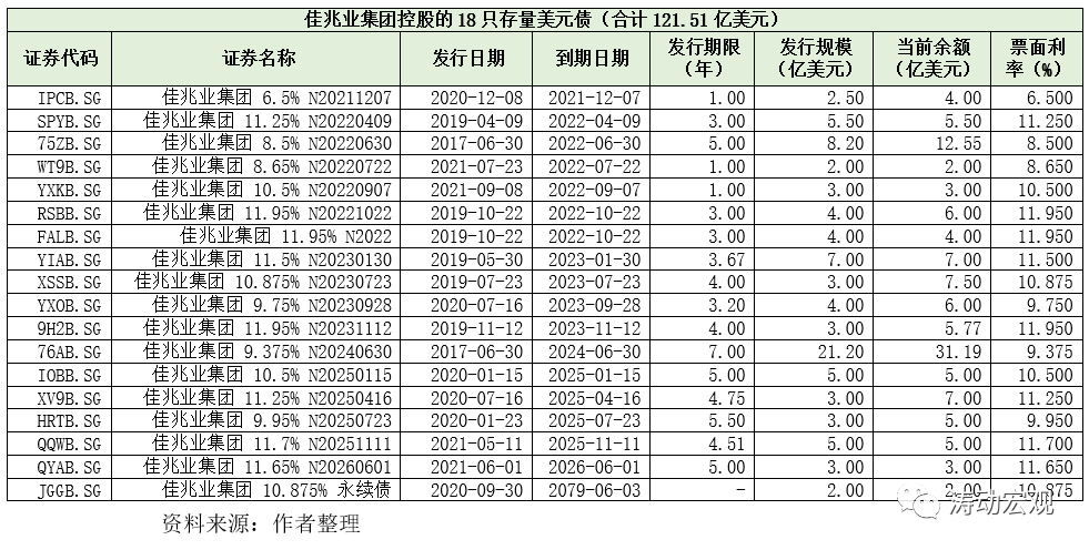 截至目前,佳兆業(yè)體系擁有不足15億元人民幣的境內(nèi)債券。不過相較而言,需要更為關(guān)注18只高利率的存量美元債,余額合計(jì)達(dá)到121.51億美元(折合人民幣800億元左右)。