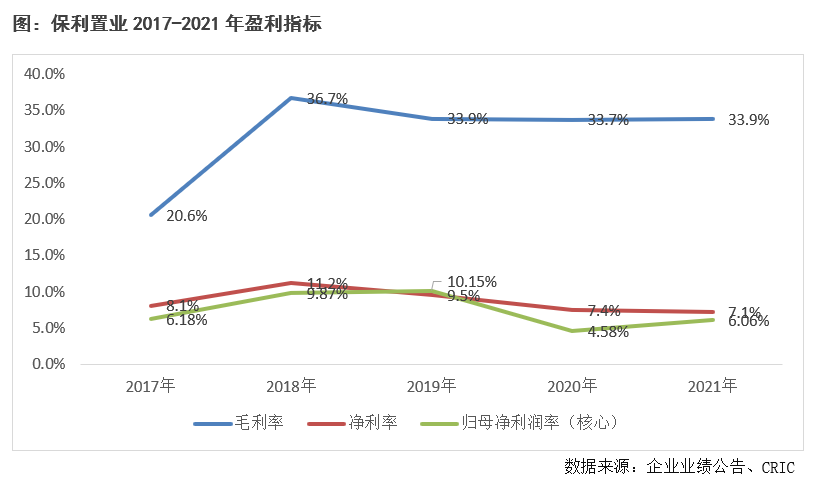 值得注意的是,2021年保利置業凈利率7.1%,歸母核心凈利率6.1%,均低于行業平均,主要由于持做銷售物業價值虧損擴大,銷管費率高于行業平均,稅費不斷上漲等原因,未來隨著低毛利率項目的逐步結轉,其盈利率水平受到的壓力或將更大。