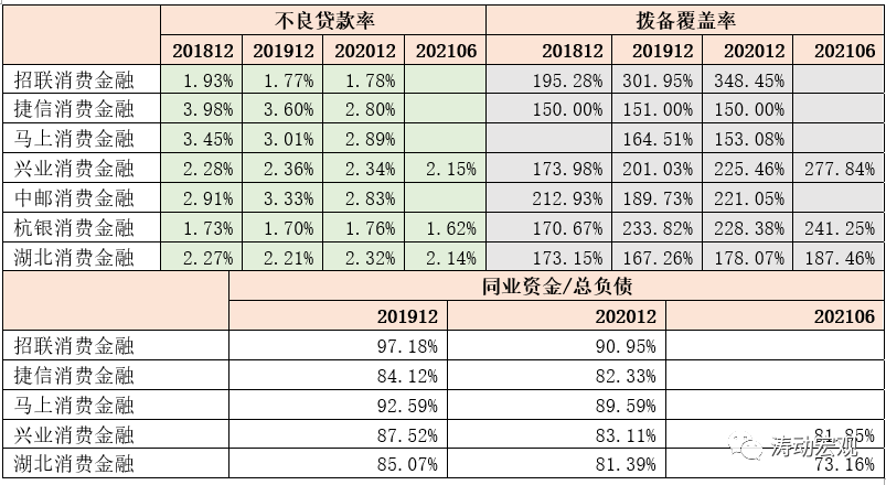 以2020年底為例,招聯消費金融、捷信消費金融、馬上消費金融、興業消費金融、中郵消費金融的不良貸款率分別達到1.78%、2.80%、2.89%、2.34%和2.83%,對應的撥備覆蓋率分別為348.45%、150%、153.08%、225.46%和221.05%。
