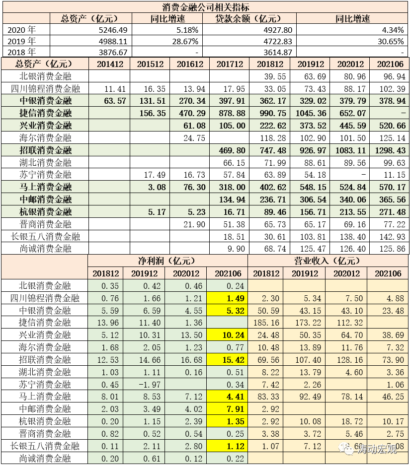 2020年以來受一系列政策約束影響,消費金融行業規模增長出現了一定程度的放緩,部分消費金融公司的規模甚至出現了萎縮。總的來看30家消費金融公司的合計體量還是比較小,預估在5000-6000億元之間。例如,2020年全部消費金融公司的總資產與貸款余額分別達到5246.49億元和4927.80億元,同比增速從2019年的28.67%和30.65%大幅降至5.18%和4.34%。