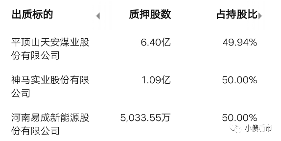 在股權(quán)質(zhì)押方面,平煤神馬分別質(zhì)押平煤股份、神馬股份和易成新能6.4億股、1.09億股以及5033萬股,占其所持股份比例的49.94%、50%和50%,可以看出其股權(quán)質(zhì)押率較高。