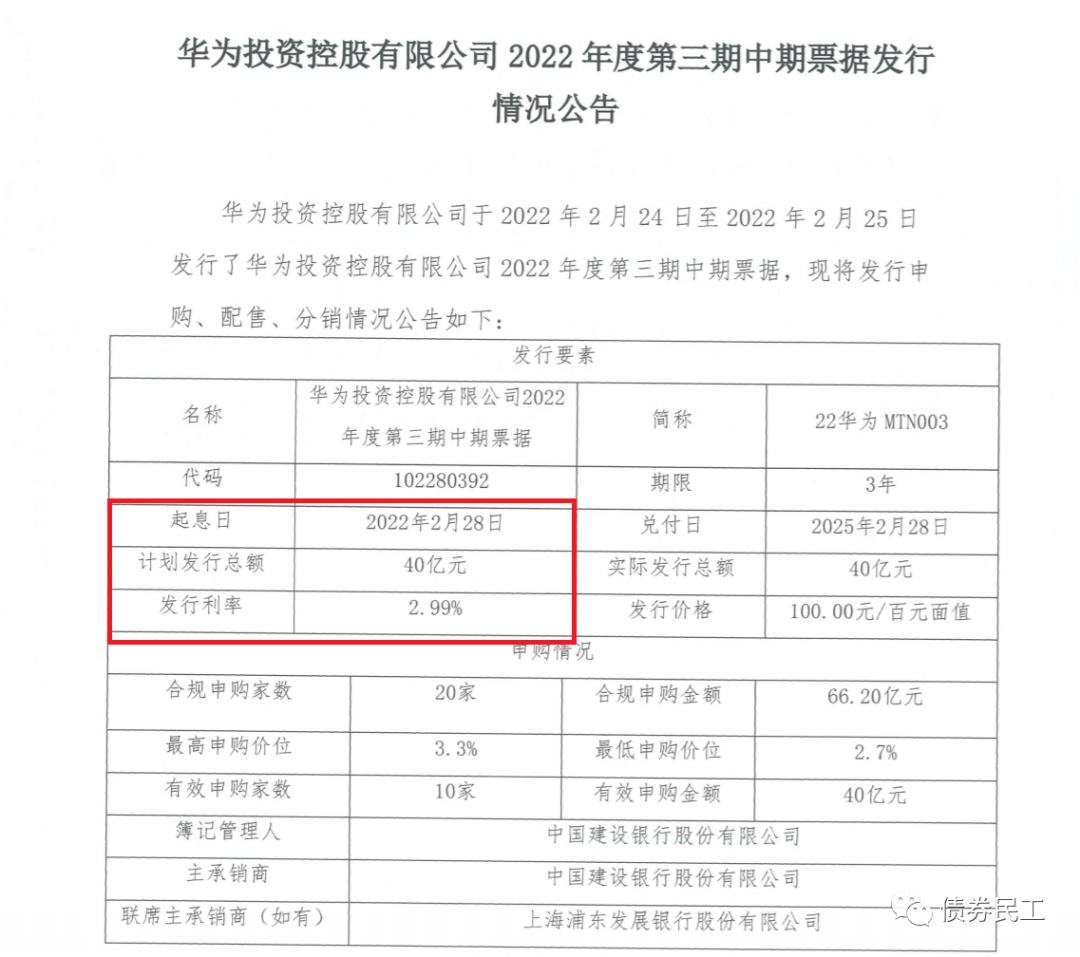 根據華為投資控股有限公司于2022年2月28日公告的發行情況公告,發行金額為40億元的“22華為MTN003”成功發行,發行利率為2.99%!