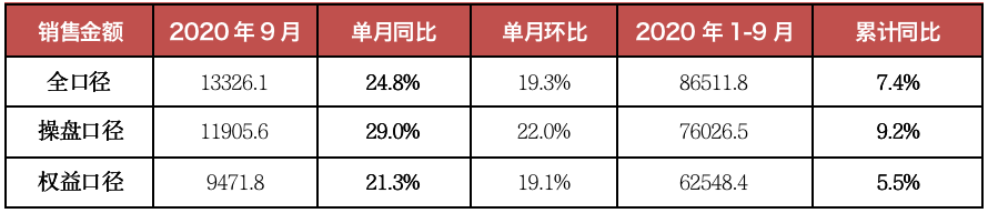 前三季度,TOP100房企全口徑銷售金額達到86511.8億元,累計同比增長7.4%。9月全口徑銷售金額達到13326.1億元,同比增長24.8%。房企單月業(yè)績自4月轉(zhuǎn)正后進一步回升,但相較于8月增幅有所收窄。