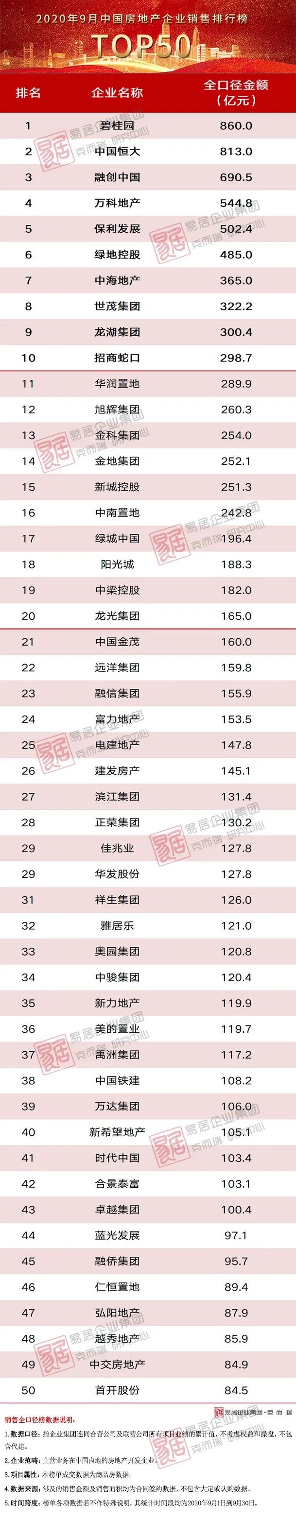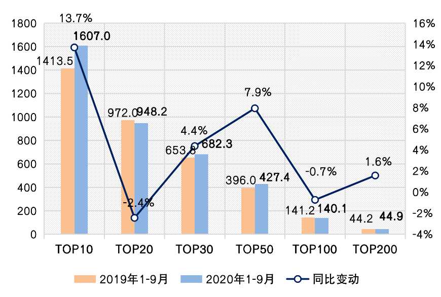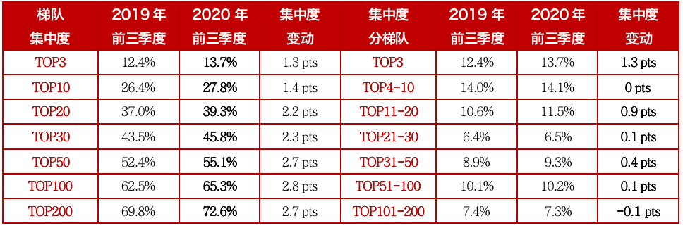 備注:操盤金額集中度=入榜房企操盤銷售金額/統(tǒng)計局公布的全國商品房銷售金額,其中,2020年前三季度全國商品房銷售金額是根據(jù)前8月累計同比增幅推算9月同比增幅所得。