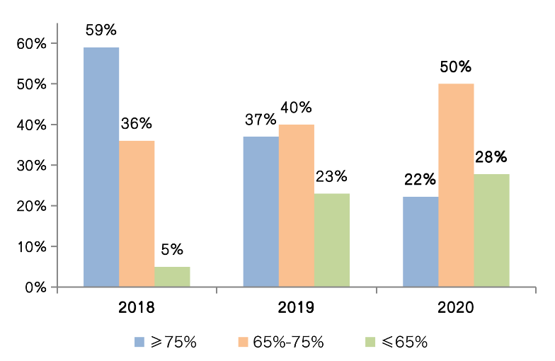 2020年,房企業(yè)績目標(biāo)的完成情況一定程度上受到疫情影響,整體表現(xiàn)不及2018、2019年同期。