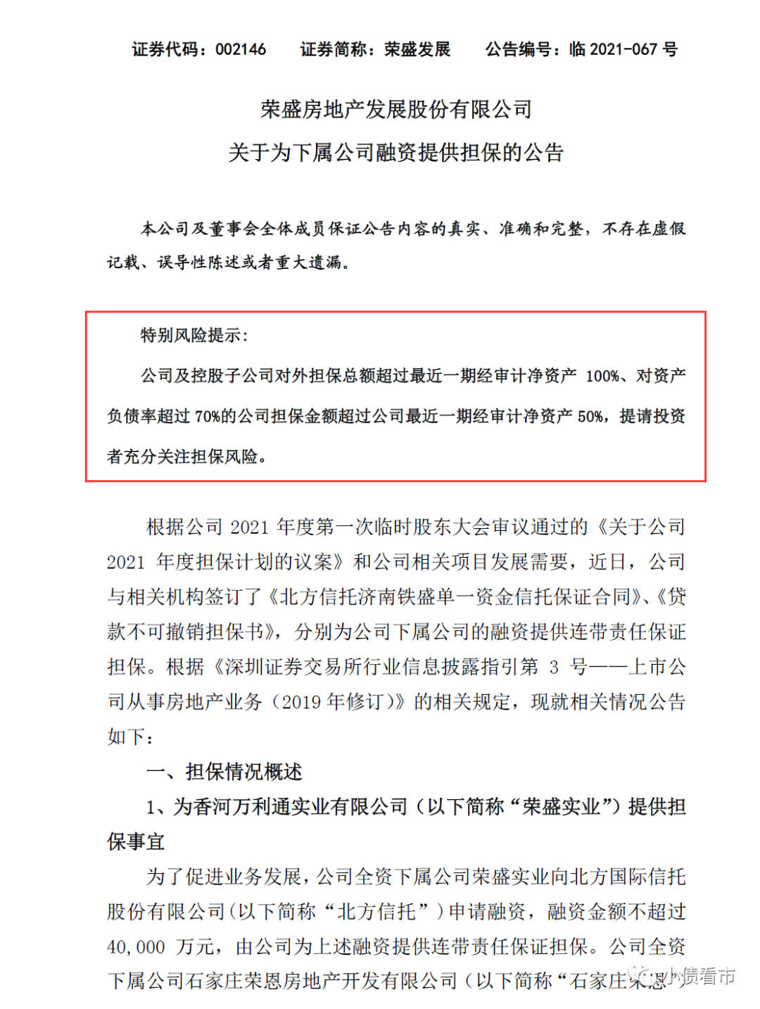 值得注意的是,公告中特別風險提示稱,榮盛發展及控股子公司對外擔保總額超過其凈資產100%、對資產負債率超過70%的公司擔保金額超過凈資產50%,提請投資者充分關注擔保風險。