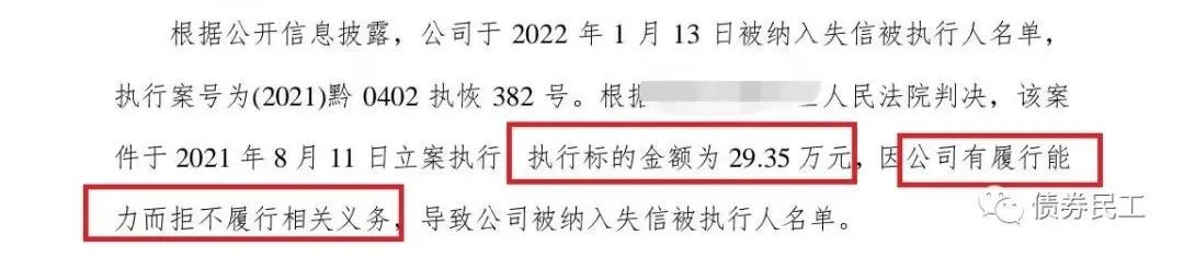 債券民工曾在某些城投公司的被執行金額越來越低了一文中感慨,城投公司的被執行金額越來越低,沒想到的是,某些城投公司失信被執行人的被執行金額也越來越低了。根據評級公司于2022年1月20日披露的公告,某城投公司因為執行標的金額為29.35萬元的案件有履行能力而拒不履行相關義務,于2022年1月13日被納入失信被執行人名單。