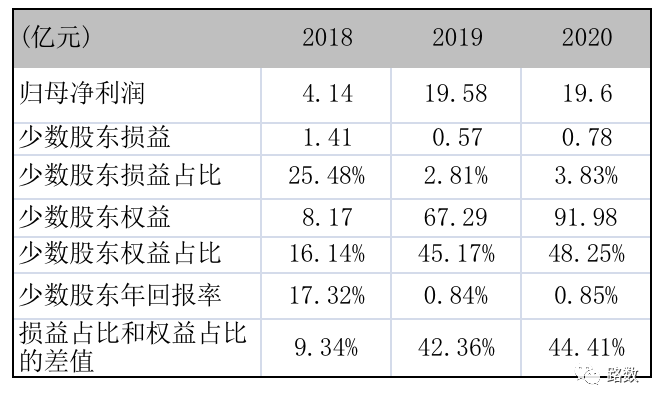 少數股東權益占比,過往三年逐年攀升,但相應少數股東的損益沒有同比增長。與此同時,少數股東權益占比與損益占比的差值逐漸擴大,且少數股東年回報率下降明顯。