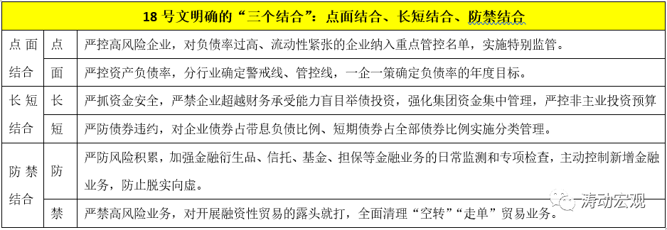 (二)考慮到3號文延續(xù)了《關于國有企業(yè)資產(chǎn)負債約束的指導意見》的要求和精神,基本上可以被視為是18號文的配套細則,因此3號文的適用性亦可以進一步推廣到河南省以外的地區(qū)。因此18號擬定的一些原則仍然值得關注,如下表所呈現(xiàn)的“三個結合”。