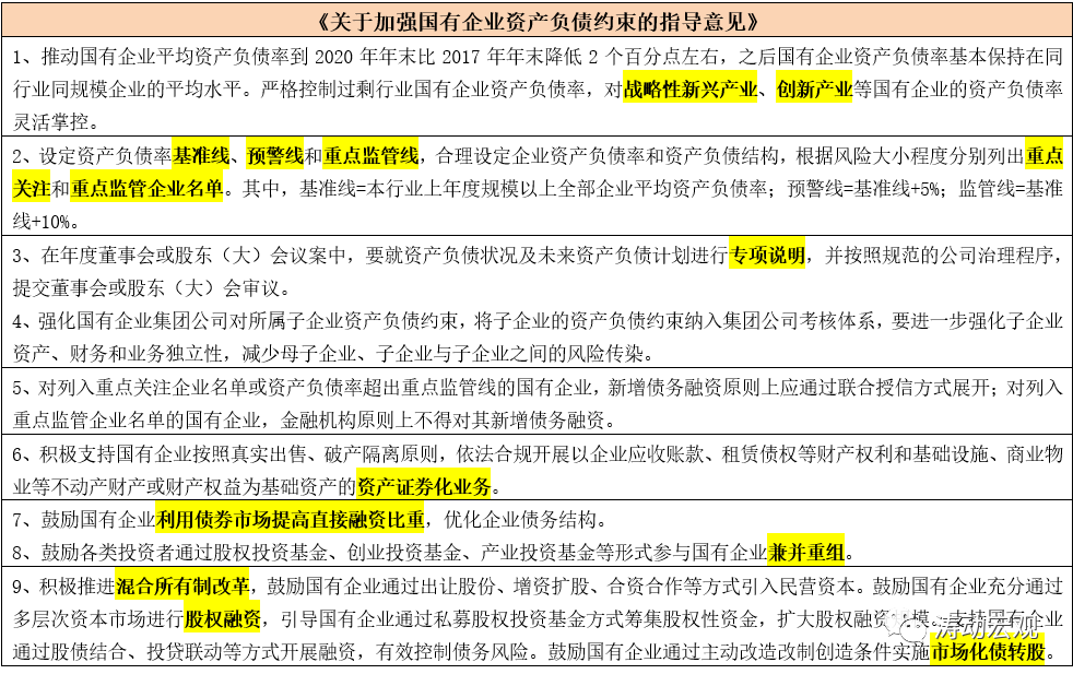 2018年9月13日,中共中央辦公廳和國務院辦公廳聯(lián)合印發(fā)《關于加強國有企業(yè)資產(chǎn)負債約束的指導意見》,將所有行業(yè)、所有類型國有企業(yè)納入資產(chǎn)負債約束管理體制,并提出了一系列要求,特別是3號文的很多規(guī)定基本上和《關于加強國有企業(yè)資產(chǎn)負債約束的指導意見》相一致,這里不再贅述(詳見下表)。