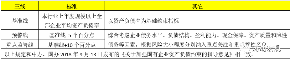 從具體內(nèi)容上看,3號文延續(xù)了《關于國有企業(yè)資產(chǎn)負債約束的指導意見》的要求和精神,很多內(nèi)容具有較好的契合性,如均提出按照基準線、預警線和重點監(jiān)管線等三線進行資產(chǎn)負債率管理,并相應設定重點關注企業(yè)和重點監(jiān)管企業(yè)。