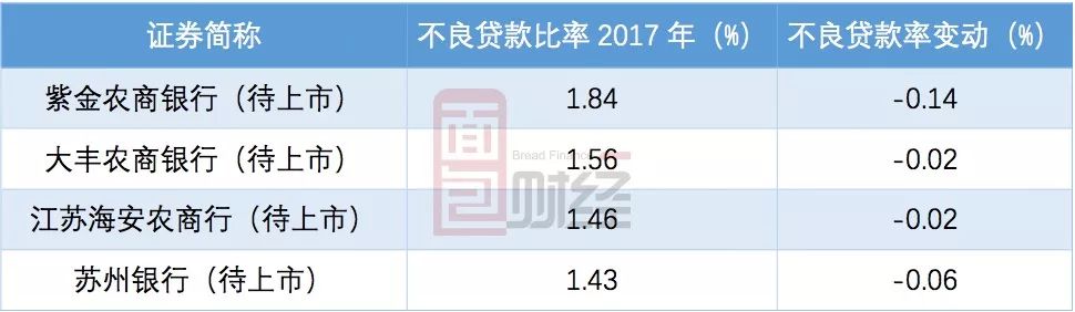 從不良貸款比率來看,四家待上市銀行2017年不良率均有小幅下降。其中,紫金農商行不良率居前,但與2016年相比下降也最多。具體排名見下表:
