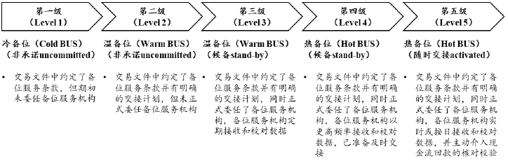 國際證券化市場參照信息科技學中的專業(yè)術語,根據服務商的接替工作準備到位程度(Readiness)的不同,把“備位服務”進一步區(qū)分為“熱備位(Hot BUS)、溫備位(Warm BUS)、冷備位(Cold BUS)”,具體含義如下: