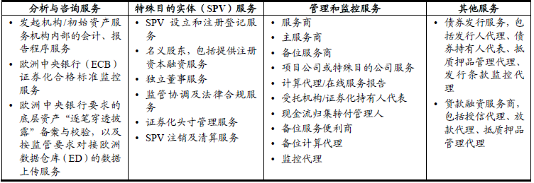 “備位服務”作為資產證券化運營風險管理的重要一環(huán),防范的是初始資產服務機構經營不善、破產等原因導致資產服務中斷的極端風險。雖然發(fā)生的概率極低,但一旦發(fā)生,影響極大,所以越來越引起市場參與者的重視。不過正是由于發(fā)生的概率極低,“備位服務”很難獨立成為一種商業(yè)模式。國際證券化市場中,備位服務機構同時也是資產服務機構,另外也提供其他相關的證券化服務。以意大利證券化綜合服務商Securitisation Services公司為例,其2001年起成為證券化服務商,如今提供證券化“一站式”(One-stop-shop)綜合服務,詳見下表四,涵蓋多種服務范圍,管理資產規(guī)模超過2,950億歐元,服務證券化交易超過360單,涉及1040多個角色、超過15個資產類別、250多家SPV,公司人數超過155人。2007年首次獲得標普服務商評級“強(Strong)”級別,2012年起至2020年連續(xù)多年獲得標普服務商多項評級“強(Strong)”級別,包括意大利ABS主服務商、RMBS和CMBS主服務商綜合評級、公司管理和組織架構單項評級、資產管理能力單項評級均為“強(Strong)”級別,展望“穩(wěn)定(Stable)” ④,成為歐洲市場領先的資產服務商和備位服務機構。